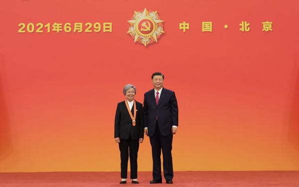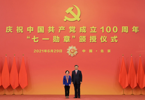 6月29日,庆祝中国共产党成立100周年“七一勋章”颁授仪式在北京人民大会堂金色大厅隆重举行。中共中央总书记、国家主席、中央军委主席习近平向“七一勋章”获得者黄宝妹颁授勋章。新华社记者 李学仁 摄