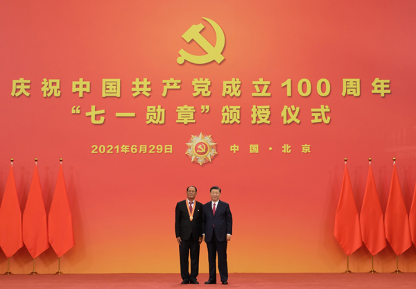 6月29日,庆祝中国共产党成立100周年“七一勋章”颁授仪式在北京人民大会堂金色大厅隆重举行。中共中央总书记、国家主席、中央军委主席习近平向“七一勋章”获得者崔道植颁授勋章。新华社记者 李学仁 摄