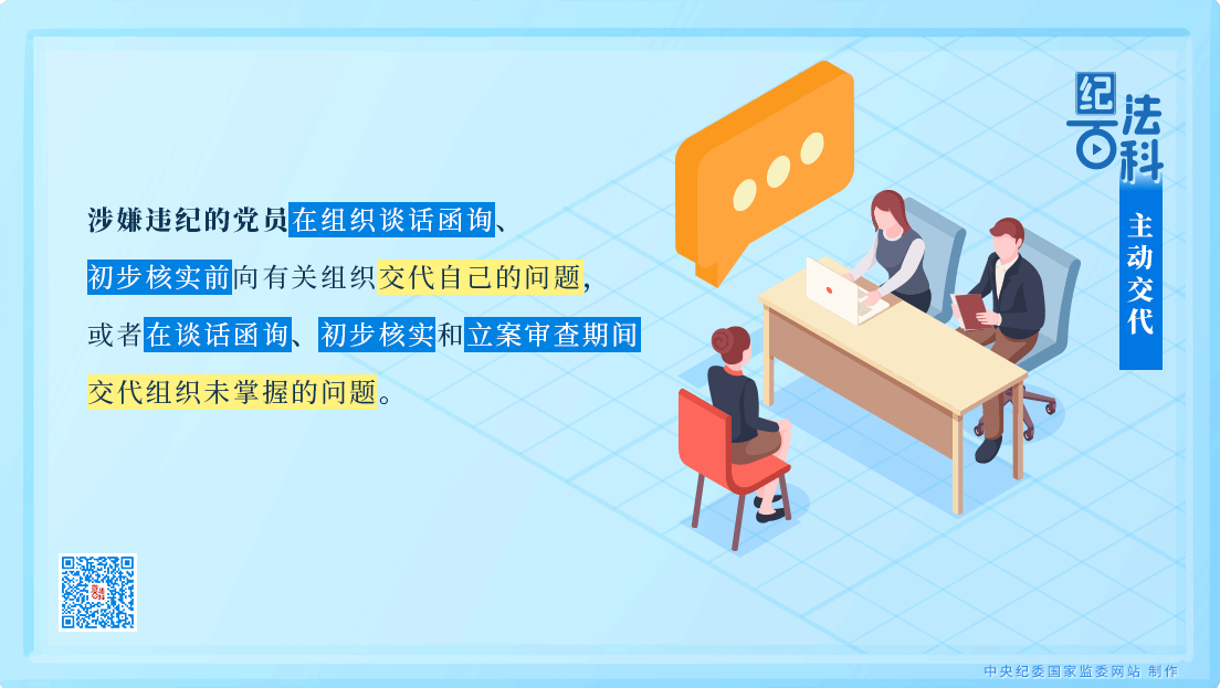 《中国共产党纪律处分条例》第四十条规定:“本条例所称主动交代,是指涉嫌违纪的党员在组织谈话函询、初步核实前向有关组织交代自己的问题,或者在谈话函询、初步核实和立案审查期间交代组织未掌握的问题。”