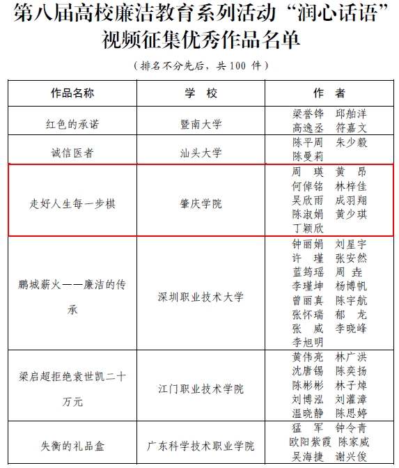 近年来,校党委认真贯彻落实习近平总书记关于新时代廉洁文化建设的重要论述,贯彻落实《关于加强新时代廉洁文化建设的意见》,在第七届全国高校廉洁教育活动中,我校音乐学院选送的歌唱作品《社会主义核心价值观》和表演作品《荷花映青天》荣获精品项目奖和优秀项目奖。本次活动我校又取得好成绩,是一直重视校园廉洁文化建设的成果。接下来,学校将不断丰富拓展校园廉洁文化建设的路径举措,组织各单位用好用活肇庆本土廉洁文化资源,用好博物馆、纪念馆、红色革命遗址、家风家训廉政教育基地等廉洁文化资源,引导学校干部师生夯实清正廉洁思想根基,厚植廉洁奉公文化基础、培养廉洁自律道德操守、弘扬崇廉拒腐社会风尚,让清风正气、崇德尚廉在校园蔚然成风,共建清新、清澈、清朗的“三清校园”。